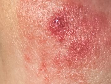 These tiny pimple like spots have a center to them that is raised and prickly to the touch. Scabies mites are generally red whereas Demodex mites appear more flesh colored with white centers.